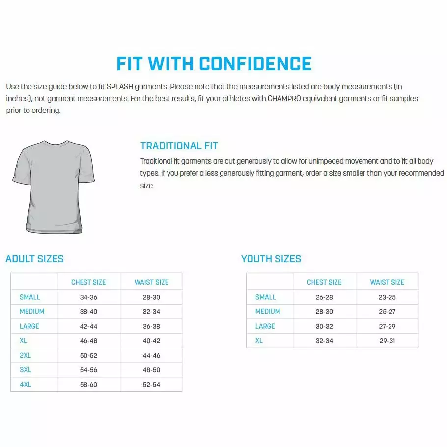 SPLASH SUBLIMATION offers sublimated apparel fast! This is a simple to use, template driven program, designed to help you build your sublimated garment quickly. To start, choose one of the stock designs available on the Uniform Builder, then change the colors, text, and add a team name to further personalize your garment. No Sleeve Logos with Splash Sublimation.