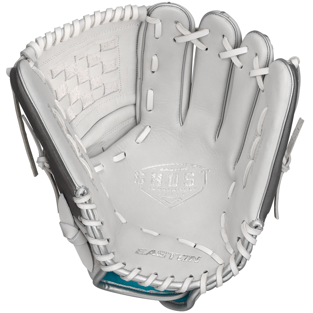 Easton’s® all-new Ghost Tournament Elite Fastpitch Series gloves are built with the exact same patterns as the Professional Collection Fastpitch gloves. These gloves are designed for the high school and travel ball player that might not yet have the hand strength of the college player, but still demands a glove that will stand up to daily use. The gloves are handcrafted with Diamond Pro Steer™ USA leather and a supple leather lining for added comfort and feel. The Quantum Closure System™ is fully adjustable for a tighter, more secure fit and optimal control. Professional grade rawhide laces add durability, while the snakeskin embossed leather accents and metallic chrome binding add extra flare.