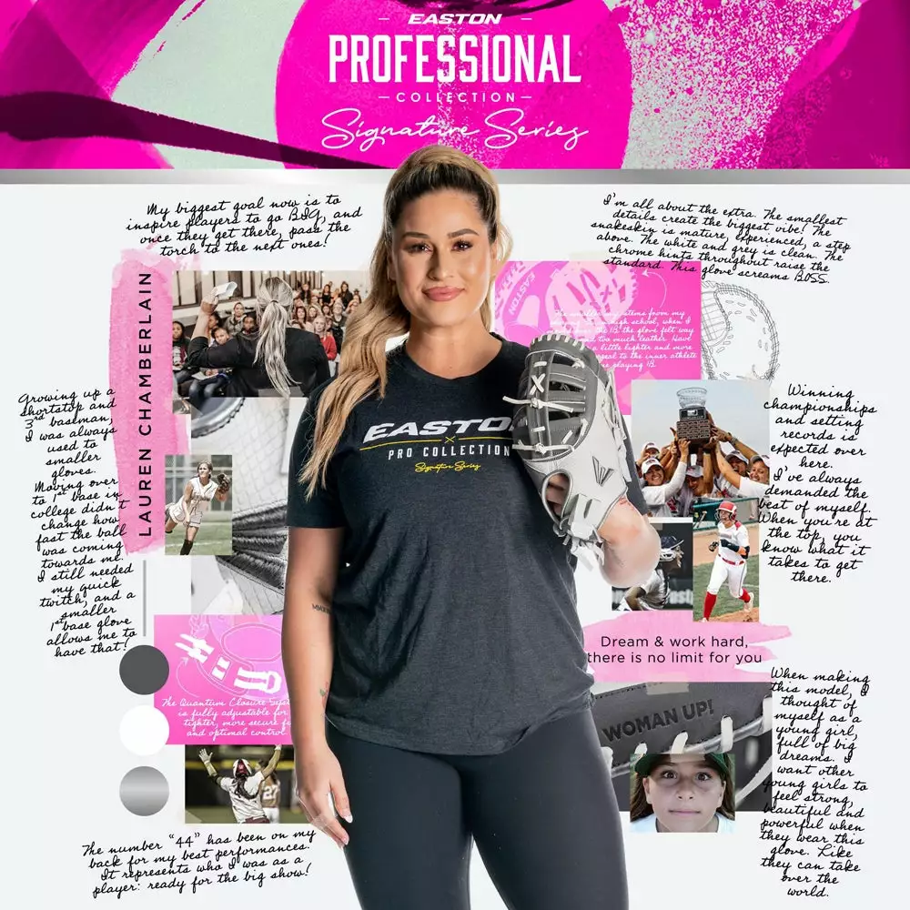 The all-new Professional Collection Signature Series, designed in collaboration with Jen Schroeder, Morgan Stuart, Lauren Chamberlain and Haylie McCleney, is Easton’s latest addition to the fastest-growing Fastpitch softball glove line in the game. Each model has several unique position-specific features, and was designed to match the style, flare and passion these athletes bring to the game of softball every day. The Signature Series is handcrafted with Premium Reserve™ USA steer hide leather and pro-grade rawhide lace. A full leather lining, binding and welting provide a durable shape and a faster break-in time. Each model features a laceless lining, an Ax® Suede back-of-wrist liner and an adjustable fit system, making the Professional Collection Signature Series the most comfortable gloves in the game.