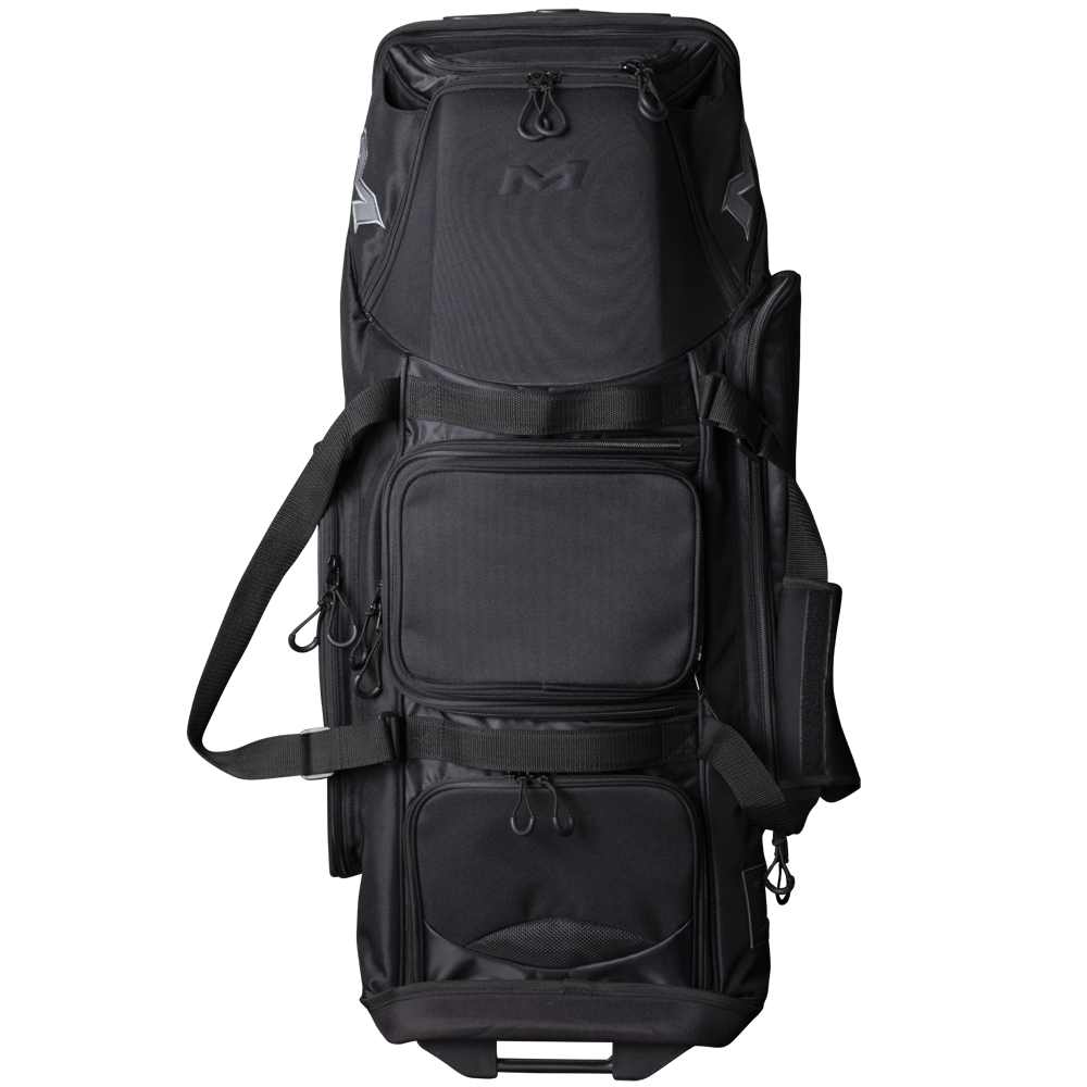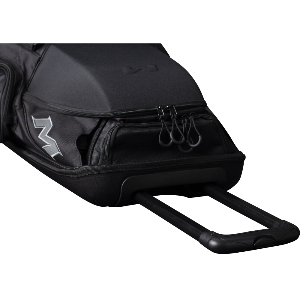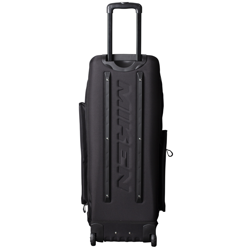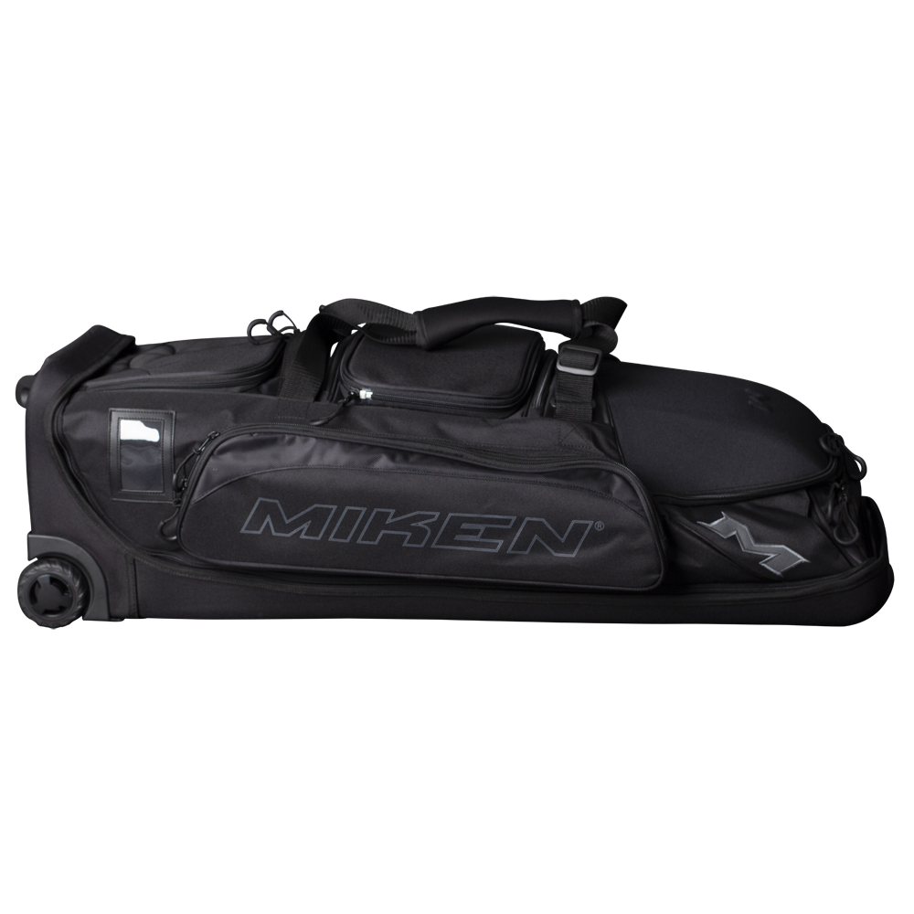 The all new Miken Pro Wheeled Bag features a a padded 4 individual bat compartment,, a telescoping handle, Wide set tank wheels with full EVA base for the ultimate support and durability, a vented shoe compartment, extra large main compartment and 2 smaller compartments, molded top converts to a shelf, removable decoration panel for customization, easy grip handles, clear ID window and durable “J” style hook.