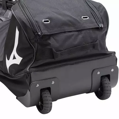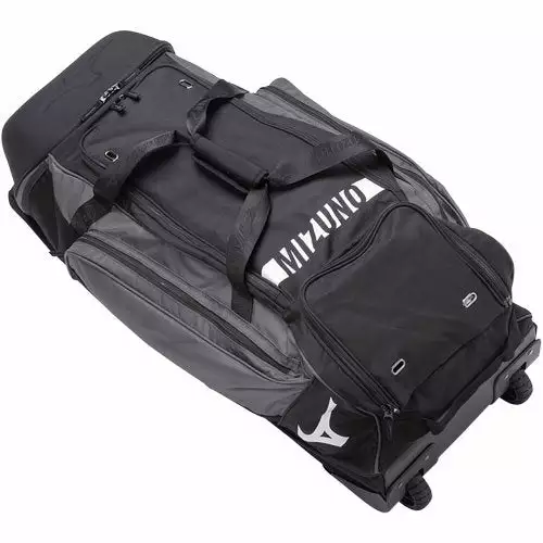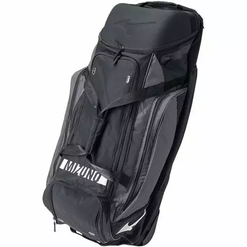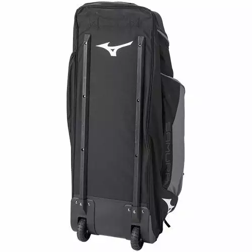 Full of exceptional features to store and protect your gear, the new Samurai Catcher’s Wheel Bag X is a popular choice with the Mizuno Pros. This catcher’s equipment bag with wheels features a molded, fleece lined glove compartment provides superior protection for your mitt, while the main compartment is designed to comfortably fit all of your gear. There are multiple side storage compartments and a ventilated footwear storage compartment with a zip off panel for embroidery. Additionally, there is an insulated drink pouch, waterproof zip valuables pocket, utility hooks for helmet/glove/etc in top glove compartment, a quick-access side bat pocket and bat zip pocket for 4 bats. Dual J hooks allows for convenient fence hanging, while off-road wheels and running boards give premium stability and toughness that catcher’s need.